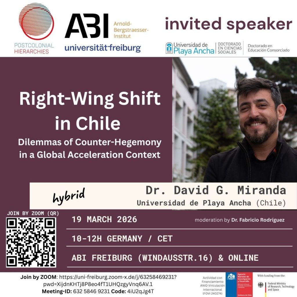 El pasado 19 de marzo de 2026, el Arnold-Bergstraesser-Institut (ABI) de la Universidad de Friburgo acogió la conferencia titulada «Right-Wing Shift in Chile: Dilemmas of Counter-Hegemony in a Global Acceleration Context«, dictada por el Dr. David G. Miranda, académico de la Universidad de Playa Ancha (Chile). La actividad, realizada en formato híbrido —presencial en Windausstr. 16, Friburgo, y transmitida en línea vía Zoom—, fue moderada por el Dr. Fabricio Rodríguez.